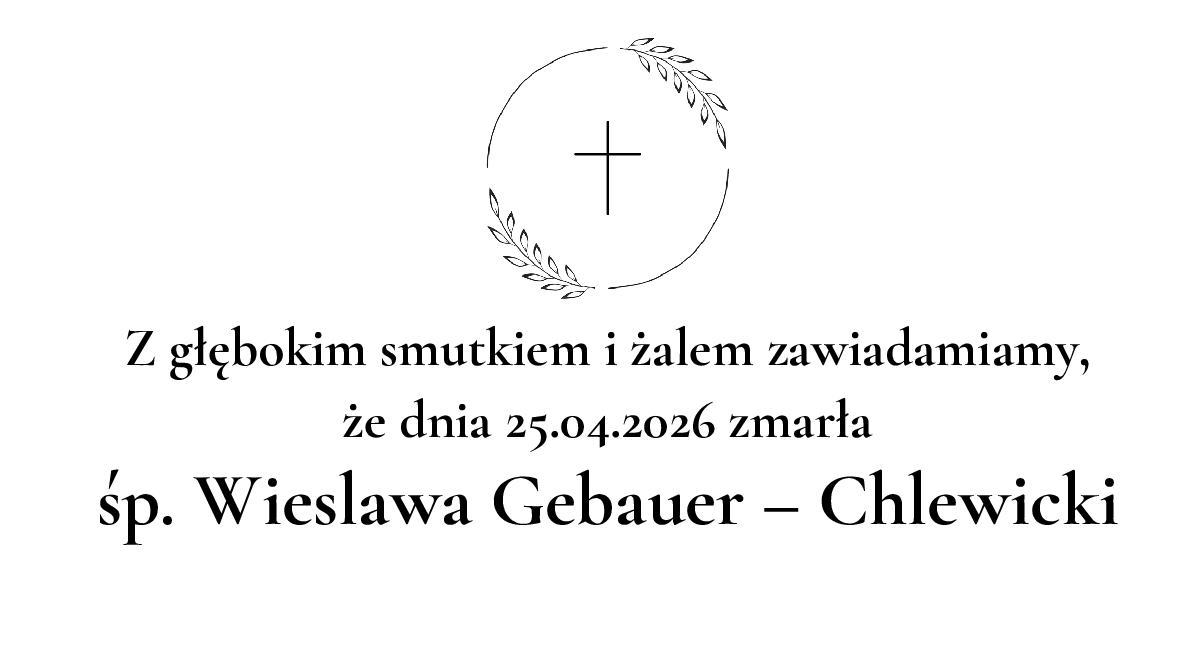 Z żalem informuję, że nie żyje Wieslawa Gebauer – Chlewicki. Pogrzeb odbędzie się 02.05.2026. Lokalizacja: komunalny przy ul. Poprzecznej . Więcej informacji na stronie https://arkaolsztyn.pl/nekrolog/wieslawa-gebauer-chlewicki/